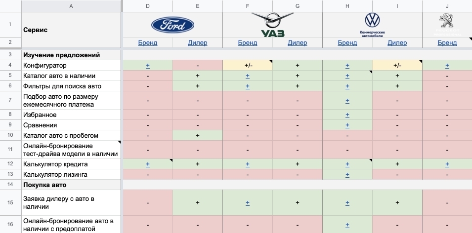 В этом случае мы сперва готовим список релевантных сайтов, чтобы проверить их по заданным критериям. Как правило, проверяем наличие определенных разделов и функций. Работа в меньшей степени творческая, больше аналитики. Время выполнения напрямую зависит от количества критериев и проверяемых ресурсов. Результат — гугл-таблица. Пример такой таблицы: