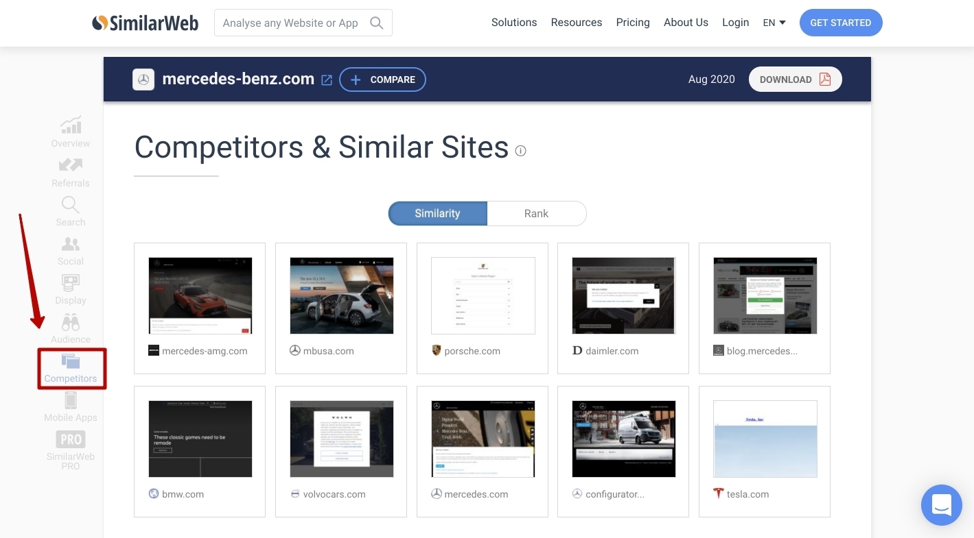 SimilarWeb — сервис, предоставляющий открытые данные веб-аналитики по сайтам. Можно зайти на страничку какого-либо сайта и увидеть список похожих сайтов в блоке Competitors.