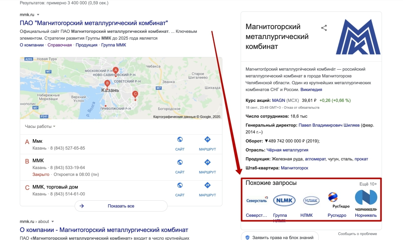 Пример: Поиск по запросу «ММК» показывает список других металлургических компаний.