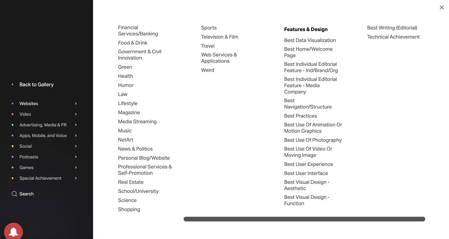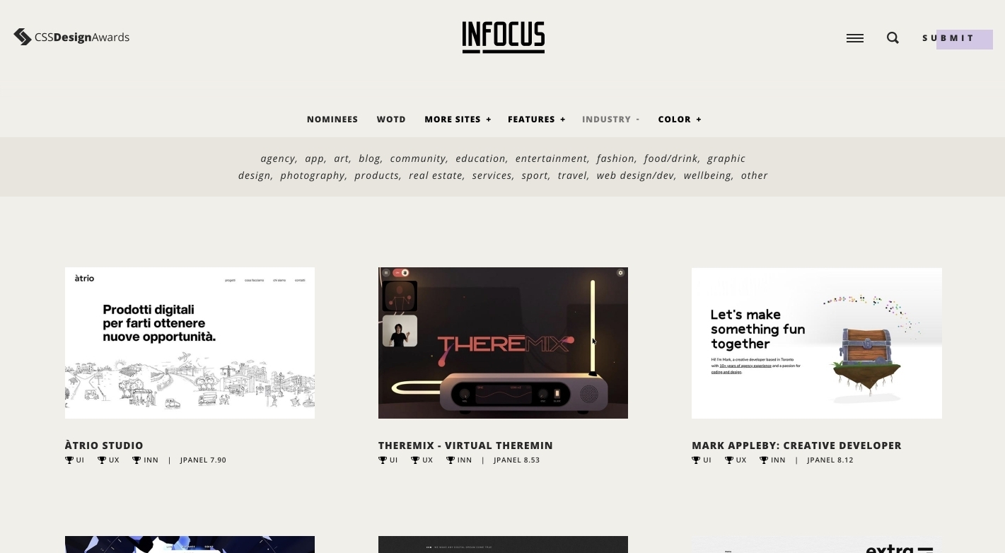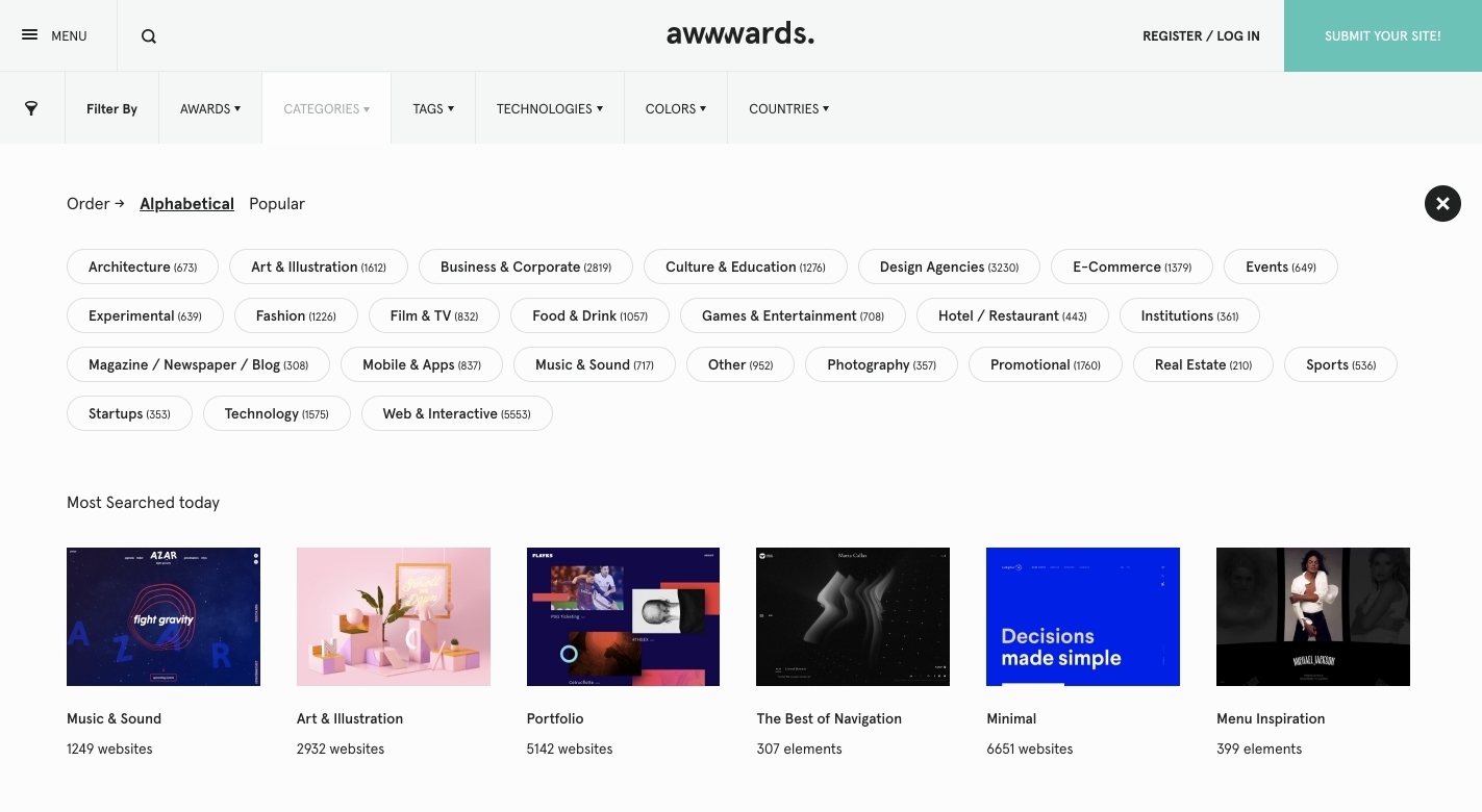Известный многим ресурс, где размещены уникальные сайты со всего мира. Можно искать решения по номинациям, категориям сайтов, тегам, технологиям, цветовой палитре и стране разработчика. Также на Awwwards есть полезный раздел Collections с различными тематическими подборками сайтов.