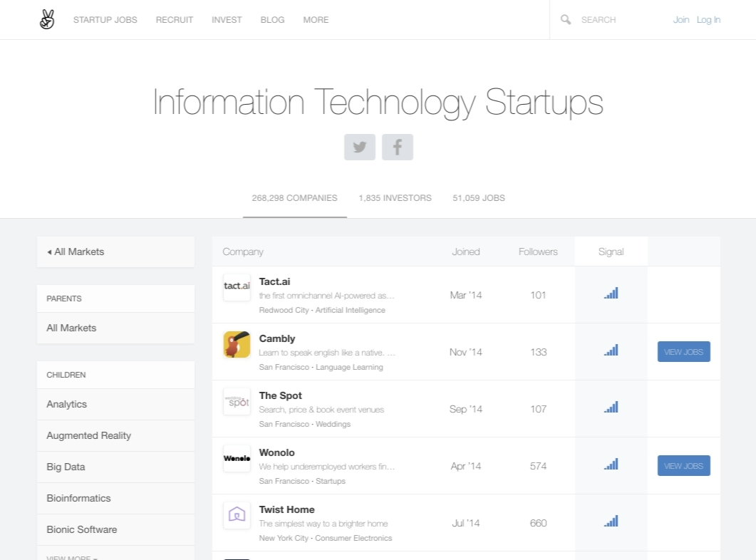 AngelList. База стартапов для соискателей и инвесторов. Более 5 млн компаний в базе.