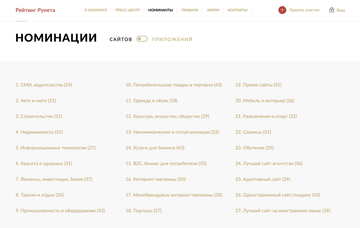 Ежегодный отечественный конкурс сайтов и мобильных приложений. Можно изучать сайты в 27 номинациях. Поскольку претендентов очень много, рекомендуем смотреть только победителей и, в крайнем случае, участников в второго отборочного этапа.