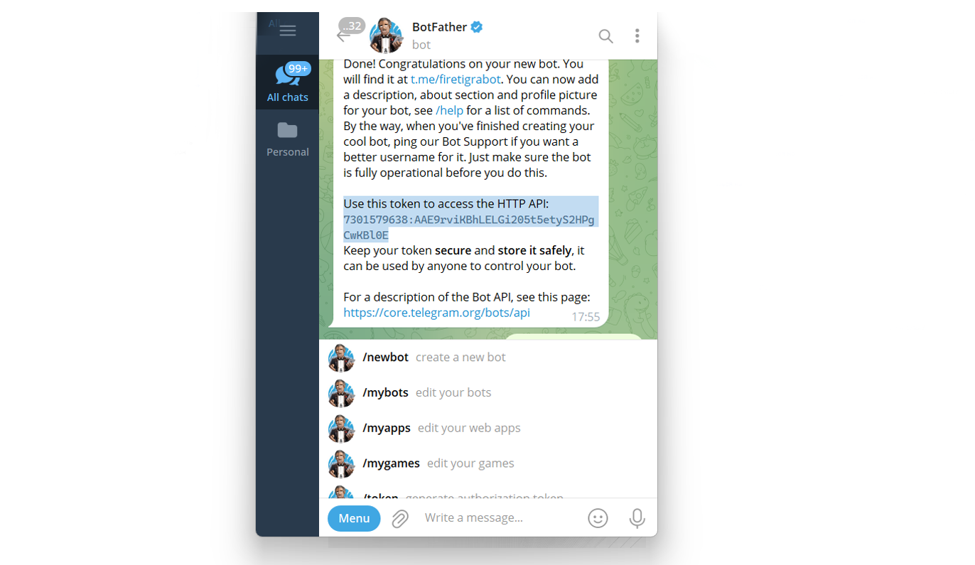 После этого Botfather предложит выбрать имя бота (любое, но обязательно с окончанием -bot), и если оно не занято, поздравит с созданием бота и выдаст токен (многозначный код), а также ссылку на описание API.