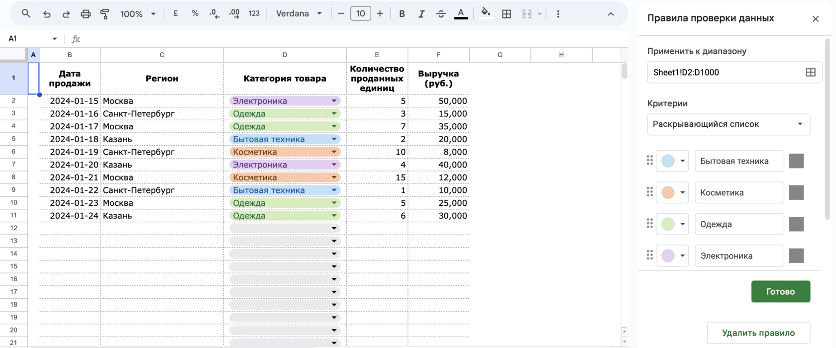 Допустим, у вас есть таблица с каталогом товаров, вы можете использовать выпадающее меню для выбора категории продукции, чтобы обеспечить точность классификации. Для этого выберете нужные ячейки и перейдите в «Данные» → «Настроить поверку данных» → «Добавить правило».