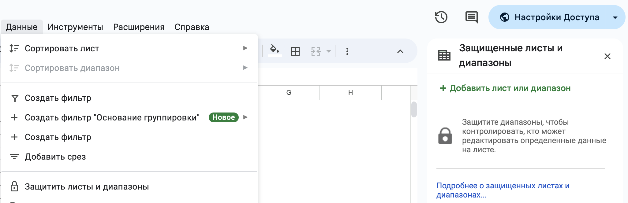 А функция «Защита данных» позволит ограничить функции редактирования и комментирования для конкретного листа или области на нем.