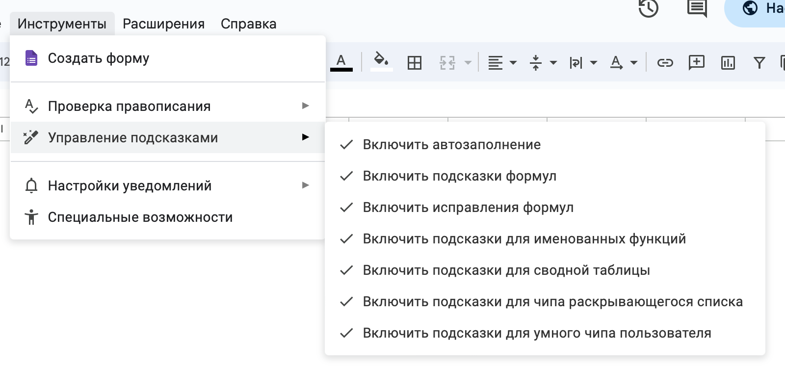 Настройка «умных» подсказок — автозаполнение, исправление и предложение формул и т. д. — помогают сделать работу с таблицами более нативной.