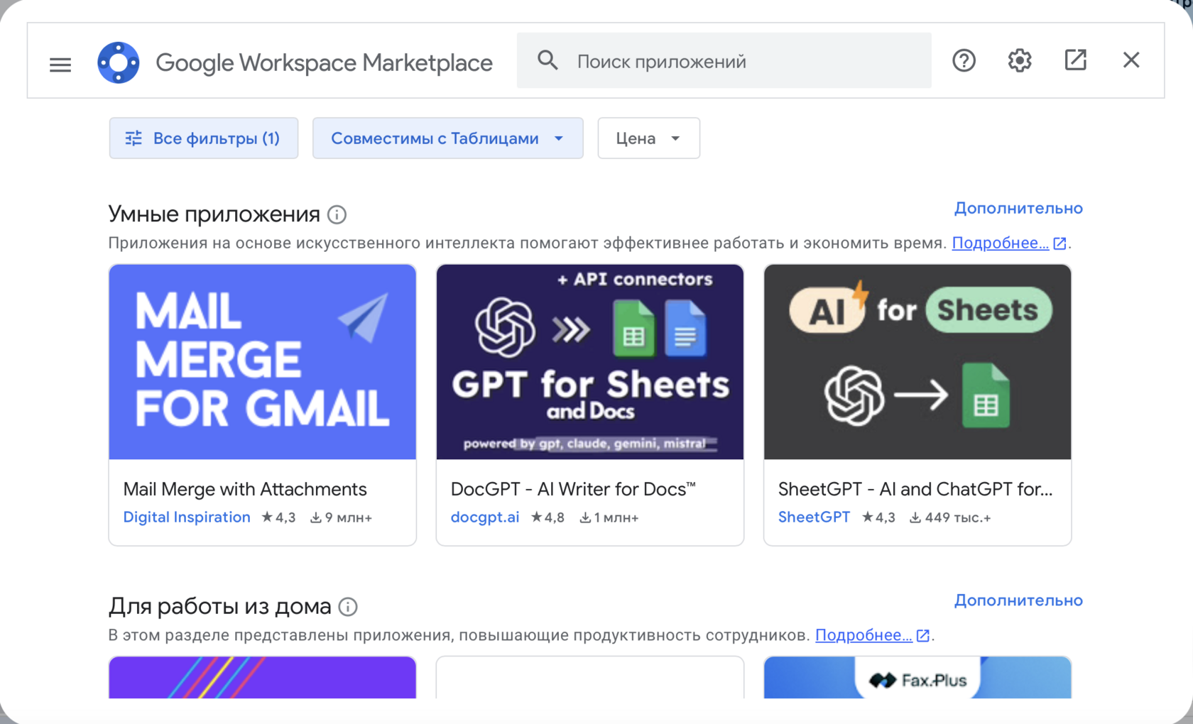 В Google Workspace Marketplace можно найти и установить множество приложений, которые расширяют функционал таблиц.