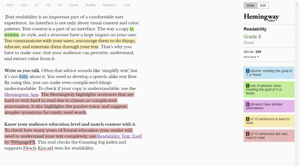 Пишите так, как вы говорите. Часто этот совет звучит как «упростите текст», однако это не совсем так. Вам необходимо грамотно организовать речь. Так вы сделаете даже сложные вещи понятными. Чтобы убедиться, что ваш текст понятный, используйте сервис Hemingway (для русскоязычных текстов можно использовать Главред). Он выделяет предложения со сложной конструкцией и пунктуацией, а также подчеркивает пассивный залог и предлагает более простые синонимы для редко используемых слов.