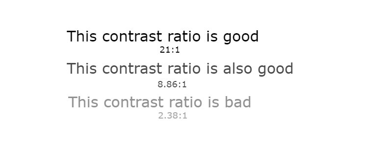 Контрастность определяет разницу в яркости между самым темным черным и самым светлым белым цветом. С точки зрения типографики, контрастность — разница яркости между цветом текста и цветом его фона. Стандартное соотношение составляет 4,5:1 для текста нормального размера (около 18,66 пикселей) и 3:1 для большого текста (более 24 пикселей). Дизайнеры используют инструмент Color safe для создания цветовых паттернов с доступным контрастом и Webaim для проверки цветового контраста.