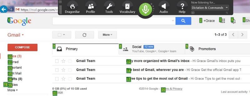 Dragon, программа для чтения с экрана и распознавания речи, которая идентифицирует ссылки по номерам. Пользователь должен указать номер, чтобы перейти по ссылке (пример из Accessibility design post)