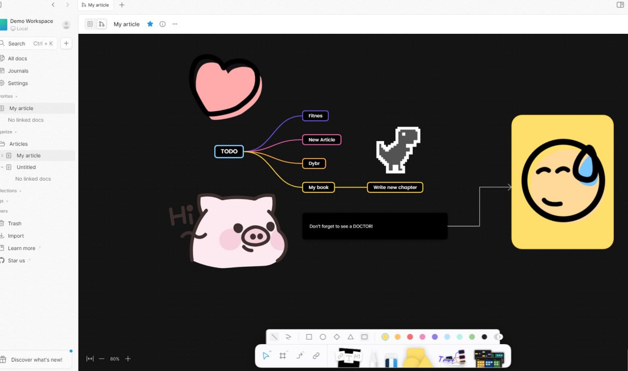 Приложение AFFiNE позиционируется как next-gen система Wiki, в отличие от Notion — с открытым кодом. Работает в облаке, основано на концепции дерева документов. Это командное рабочее пространство, которое при этом является полностью локальным. По словам самих разработчиков, сервис может заменить Notion и Miro. При этом на самостоятельном хостинге можно иметь полнофункциональную веб-версию. Это единственная (помимо Outline) self-host альтернатива Notion с поддержкой веб-технологий.