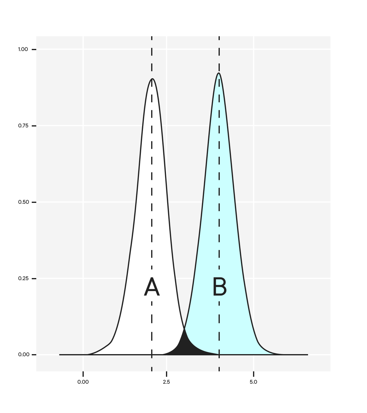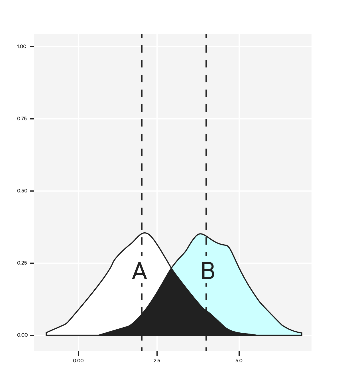 Обычно для принятия положительного решения об эффективности изменений выбирают уровень значимости 90%, 95% или 99%. Соответственно, пересечение распределений составляет 10%, 5% или 1%. Низкий уровень значимости повышает риск ошибочной интерпретации результатов изменений.