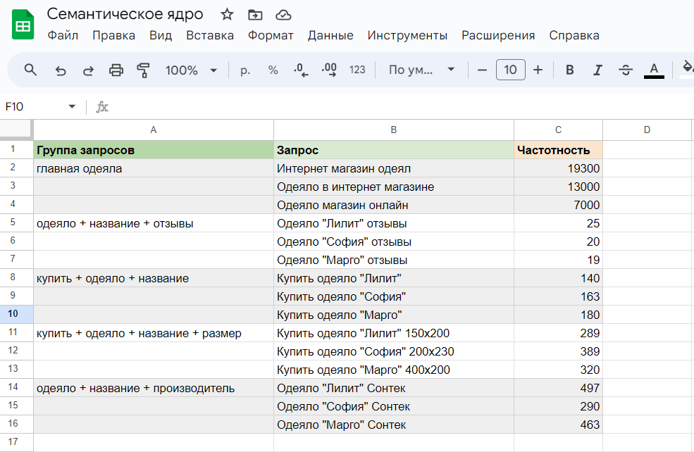Семантическое ядро содержит основные ключевые слова с указанием их частотности. Его удобно составлять в виде электронной таблицы