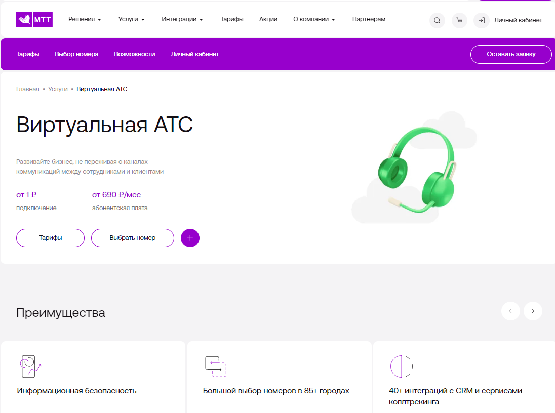 Карточка товара на сайте mtt.ru, разработанном Uplab. Содержит подробное описание услуги, тарифов и преимуществ; оптимизирована для поиска