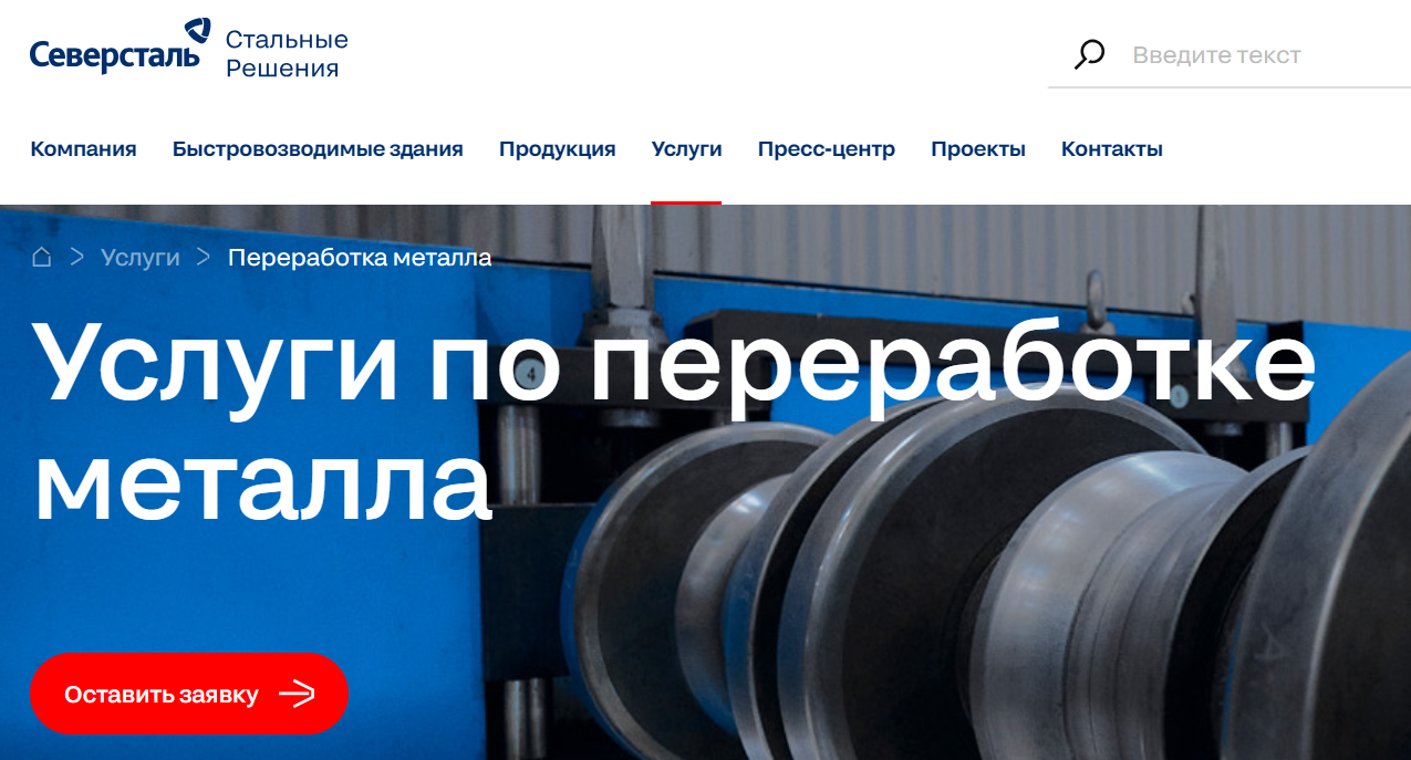 Сайт для компании Северсталь, разработанный Uplab, имеет удобную навигацию по разделам товаров и услуг
