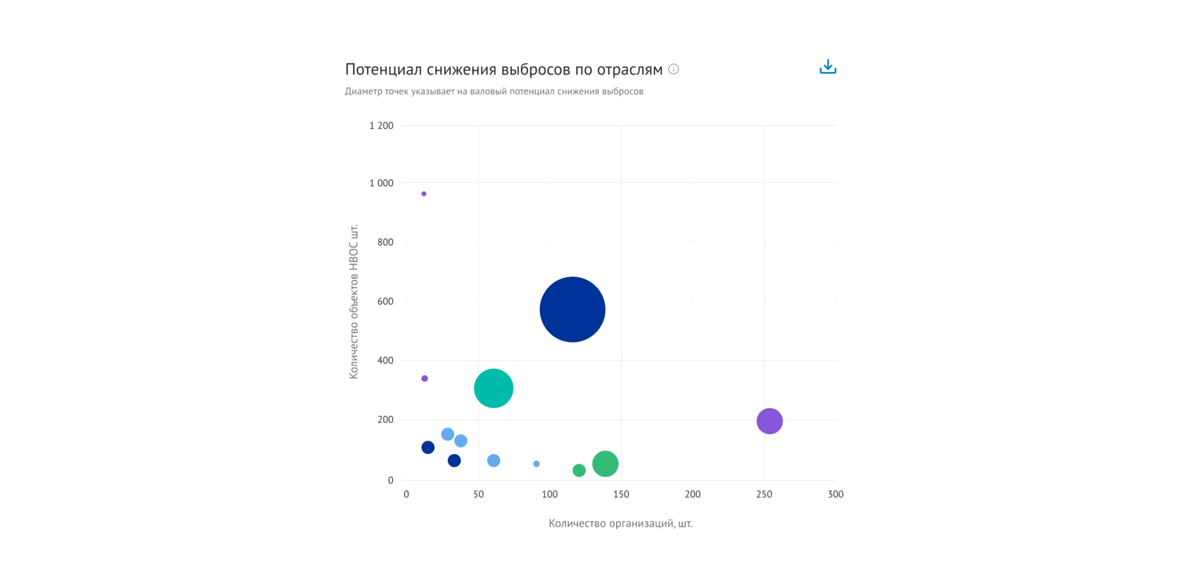 Все дашборды этого проекта интерактивные, и это было одним из пунктов технического задания. Например, в пузырьковой диаграмме «Потенциал снижения выбросов по отраслям» размер пузырьков отражает объем выбросов, а наведя на него курсор, можно увидеть таблицу с данными статистики.